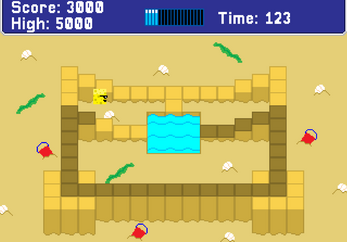 Bounce through 4 levels on the beach in this tile-based high-score puzzle game, hydrating all the sand tiles within the time limit to earn points. Make sure Sponge stays hydrated though, otherwise you can't hydrate the tiles. Every time you beat a level, you are also rewarded bonus points depending on your water level and time left. If time runs out though, your score is reset and you return to level 1! Upon completing level 4, you are returned to level 1 and your time is decreased by 10. You will continue to loop through the levels until you run out of time or quit. Have fun!